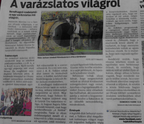 A rendhagyó irodalomórát Kónya István tanár úr nyitotta meg, néhány érdekességet megemlítve az íróról. Megtudhattuk, hogy T olkien fejében hogyan született meg A Gyűrűk Ura varázslatos világa, és hogyan hagyta félbe a készülő könyvét, csak hogy belekezdhessen A Hobbit megírásába. Tanár úr olyan érdekességeket mesélt el a könyvről és a film rendezéséről egyaránt, amik mindannyiunk figyelmét felkeltették. Ezután vette kezébe mindenki a saját példányát, és lapozta fel a kedvenc részét. Néhányan voltak olyan bátrak, hogy megosztották velünk az általuk kiválasztott szövegrészletet vagy verset. Azonban a legizgalmasabb részeket Zsuzsa néni előadásában hallhattuk, aki szeretettel ajánlja a művet a kisgyermekektől kezdve a fiatalokon át az idősebb nemzedékekig mindenkinek. A legtöbb diák behunyt szemmel, a Tolkien által megalkotott különleges világot maga elé képzelve hallgatta végig a könyvrészleteket. Zsuzsa néni vigyázott arra, hogy ne áruljon el túl sokat, mégis felkeltse a közönség érdeklődését, így nem csoda, hogy lelkes hallgatóságra talált bennünk. Az érdekes programnak a csengőszó vetett véget, mindannyiunk nagy bánatára.